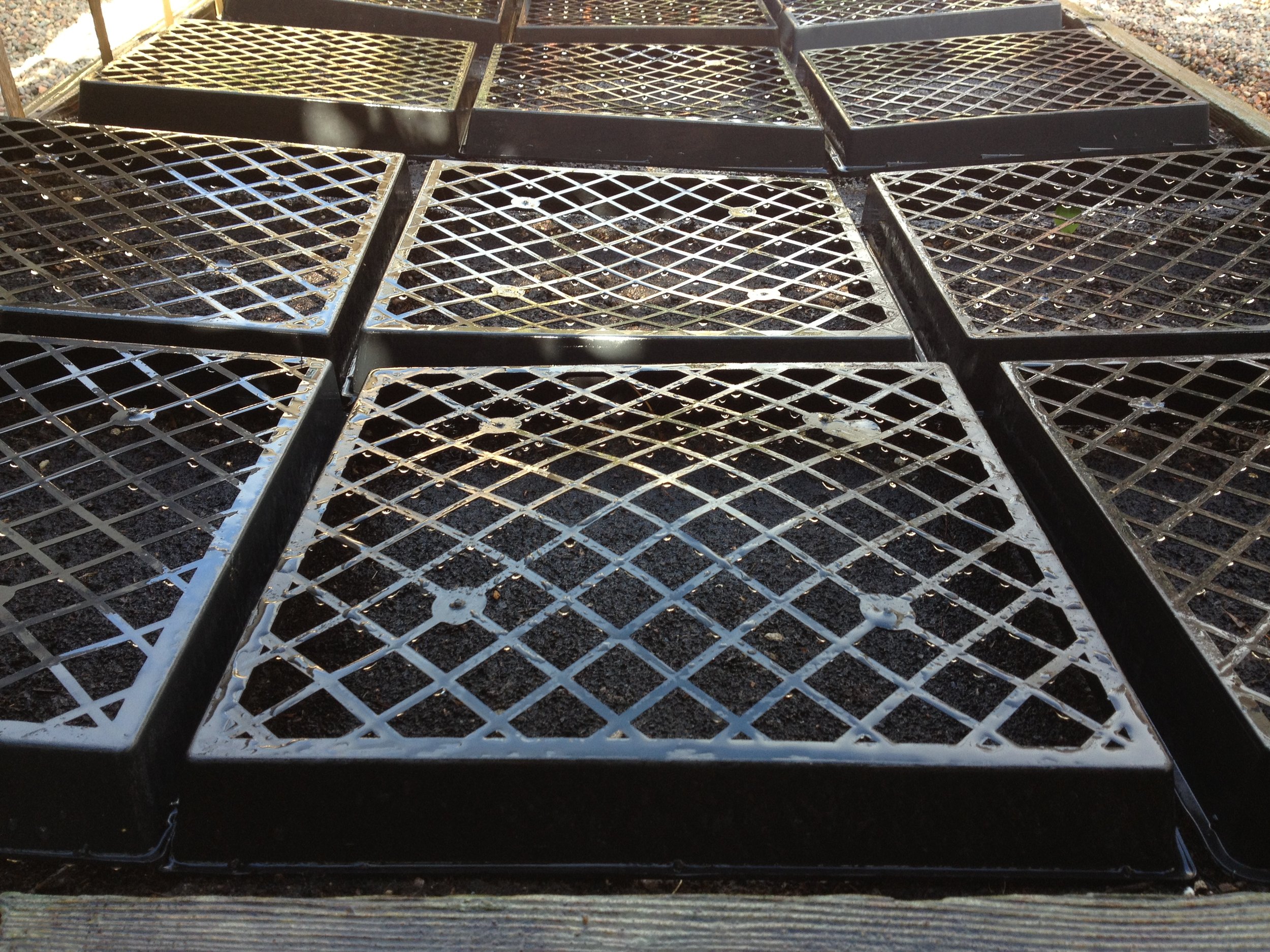 The trays protect seedlings from birds that would pluck up seedlings and critters that would disturb the soil. The trays with smaller openings offer some shade and disperse water from the hose sprayer.