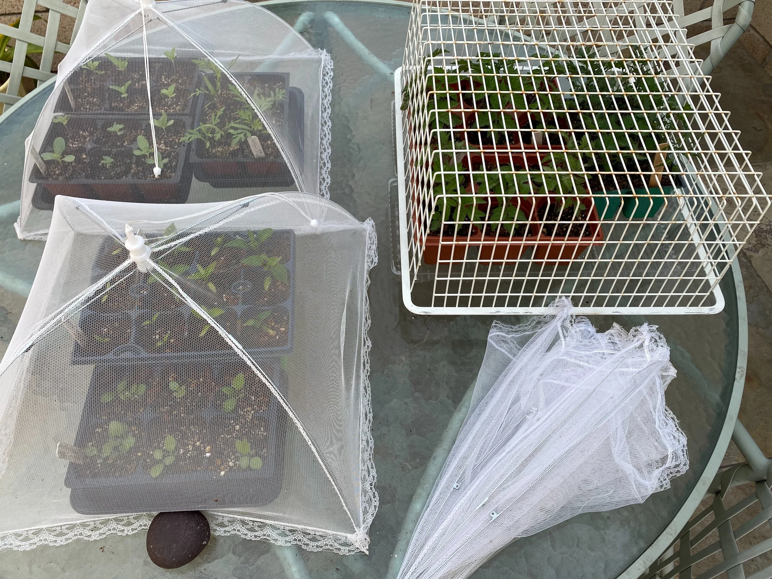 Once my seeds have germinated indoors, most are moved outside at least during the day. Ravens were taking an interest in them this spring so I brought out my pop-up mesh food covers which are devoted to garden uses.