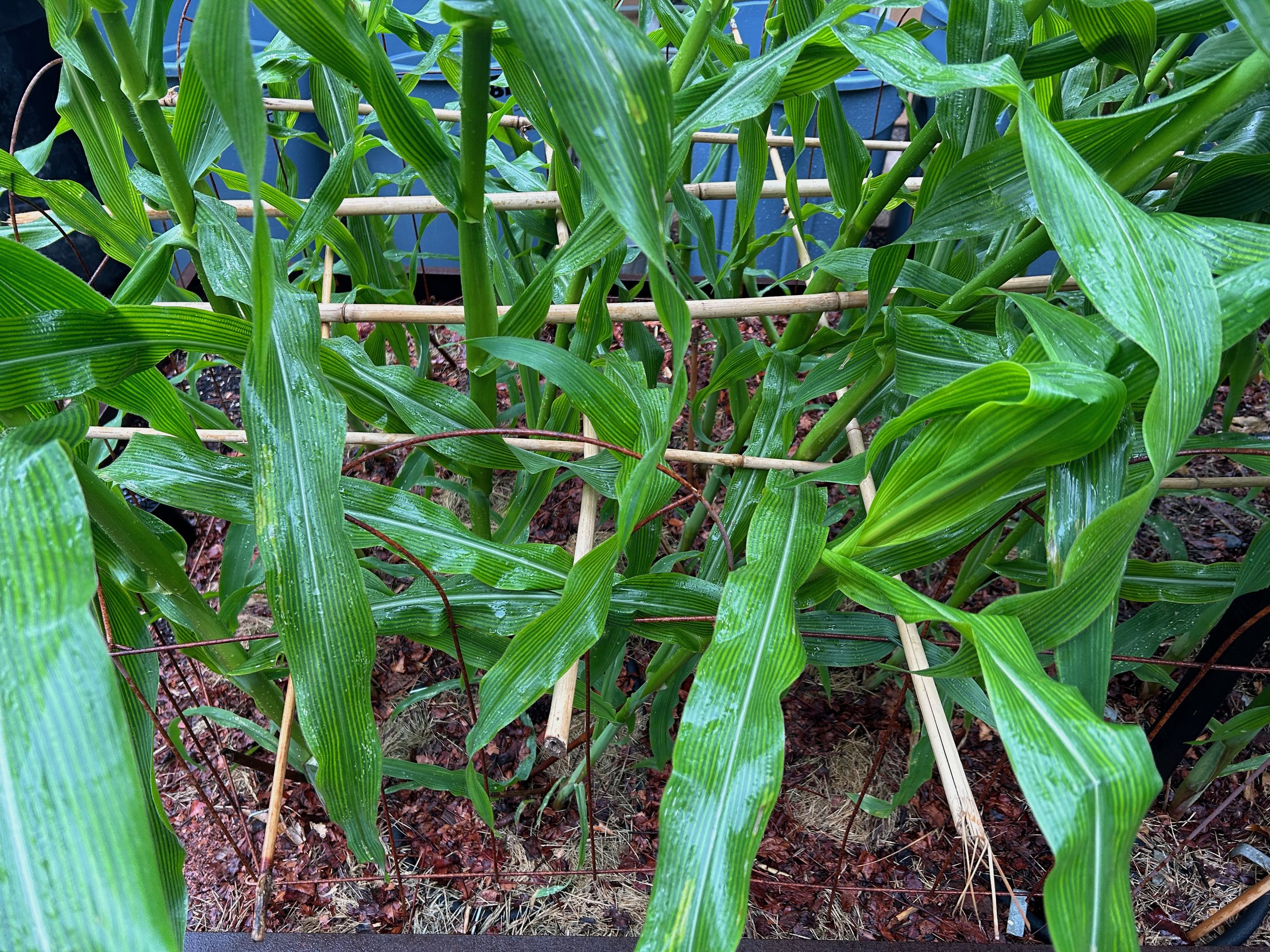 I speculated that a haphazard grid of bamboo might deter some well-fed raccoons, which can be the size of small to medium dogs in our ‘hood. To further discourage interest in the corn I sprinkled a horrid smelling mixture of donated peppery spices around the plants. I also doused the bed with Plantskydd granules which has diverted the opossums from making Swiss cheese of our small front lawn. I also used the peppery mix and Plantskydd outside the fence on the alley from whence the critters come. Bird spikes atop the wood fence also make the entry problematic for them.
