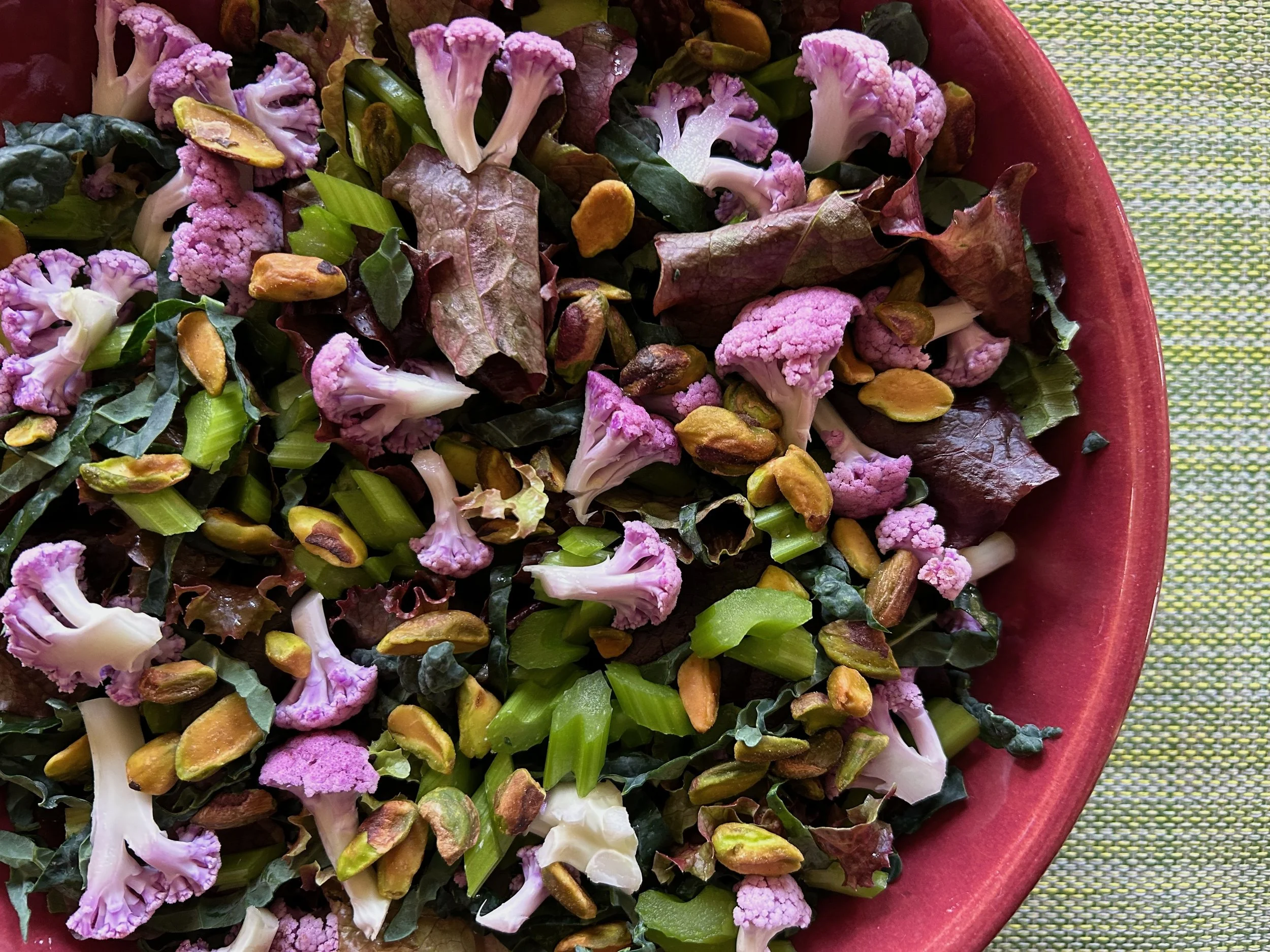 A salad with similar harvests of four kinds of lettuce, Tuscan kale, celery and purple cauliflower came together for a dinner with family.