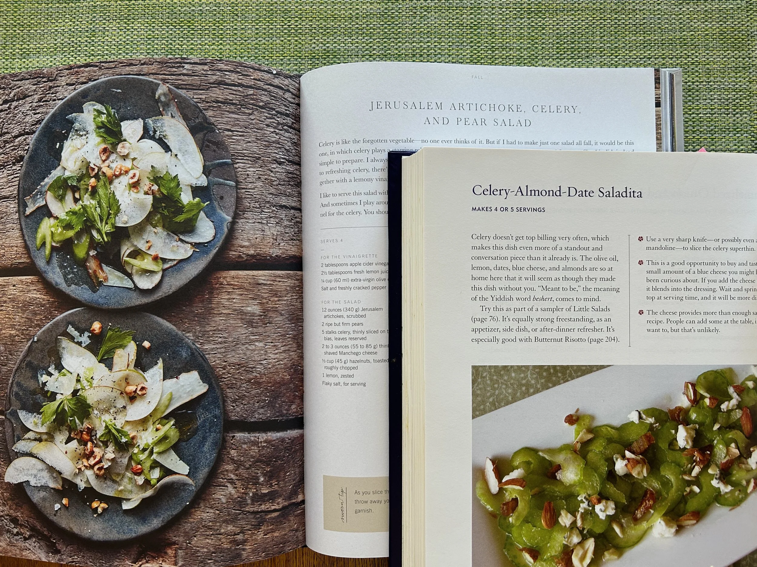 I did a riff on Celery-Almond-Date Saladita with subs for what was on hand: pistachios, dried cranberries and herb goat cheese. I’ll make it again with surplus celery for the pleasant flavors and textures.