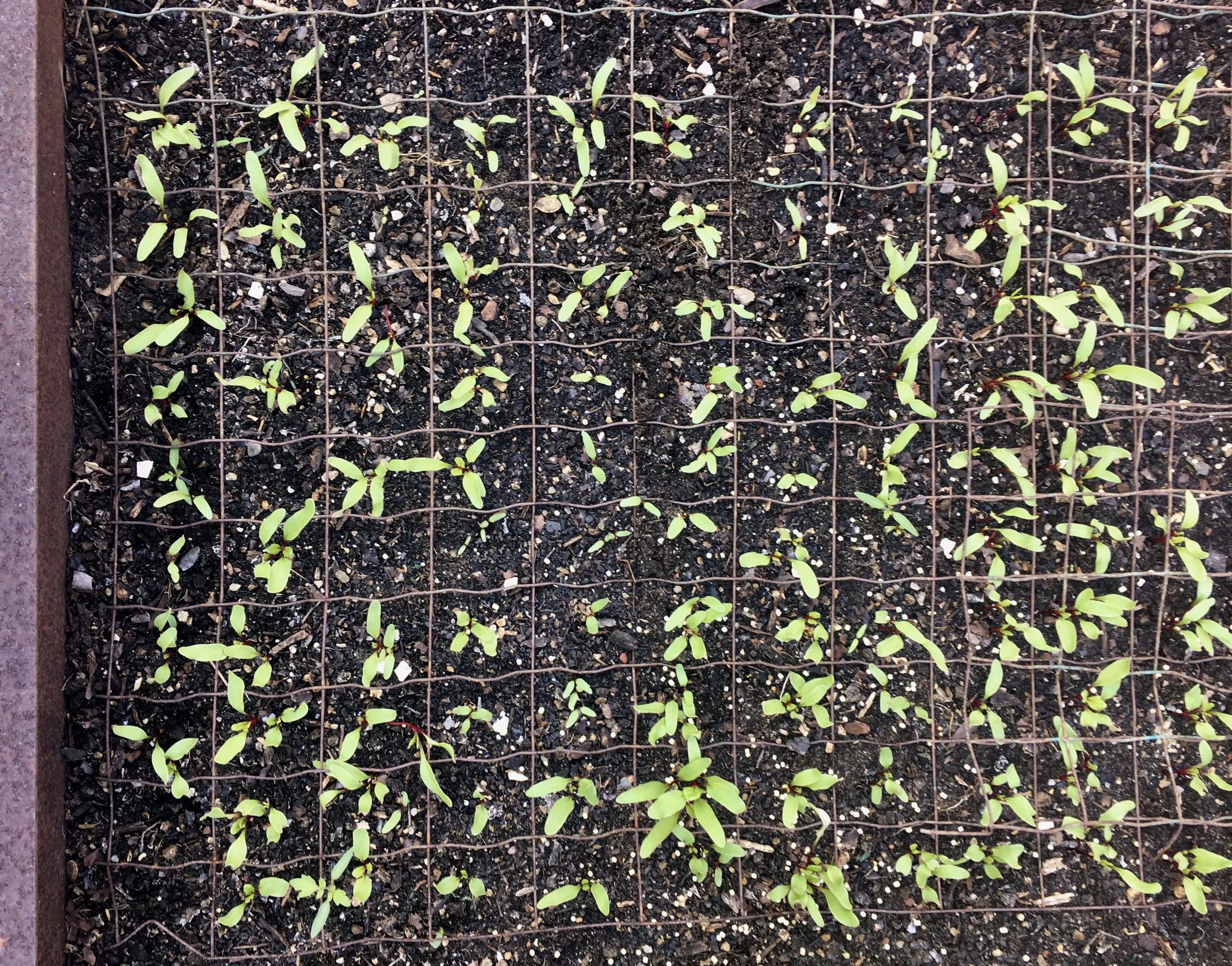 Not everyone likes beets but they’re on my top ten favorite vegetables list. They store well in my fridge for several months and the enjoyment and recipe trials are extended. I plant them close together—about 80 seeds using a wire grid in a 24 x 48 inch area. I use the recommended seed priming method described at GrowVeg. Their method resulted in about a 90% germination rate.