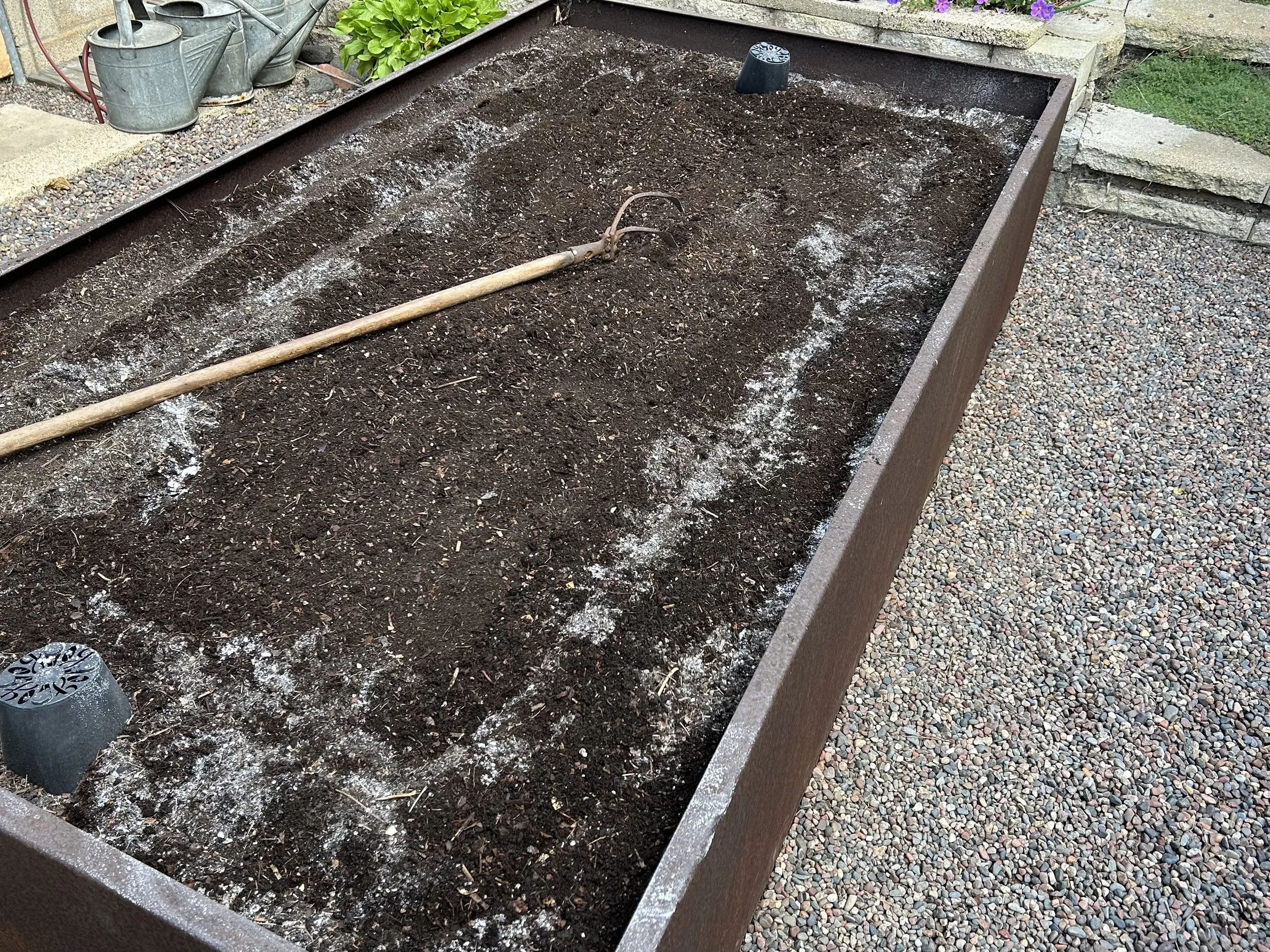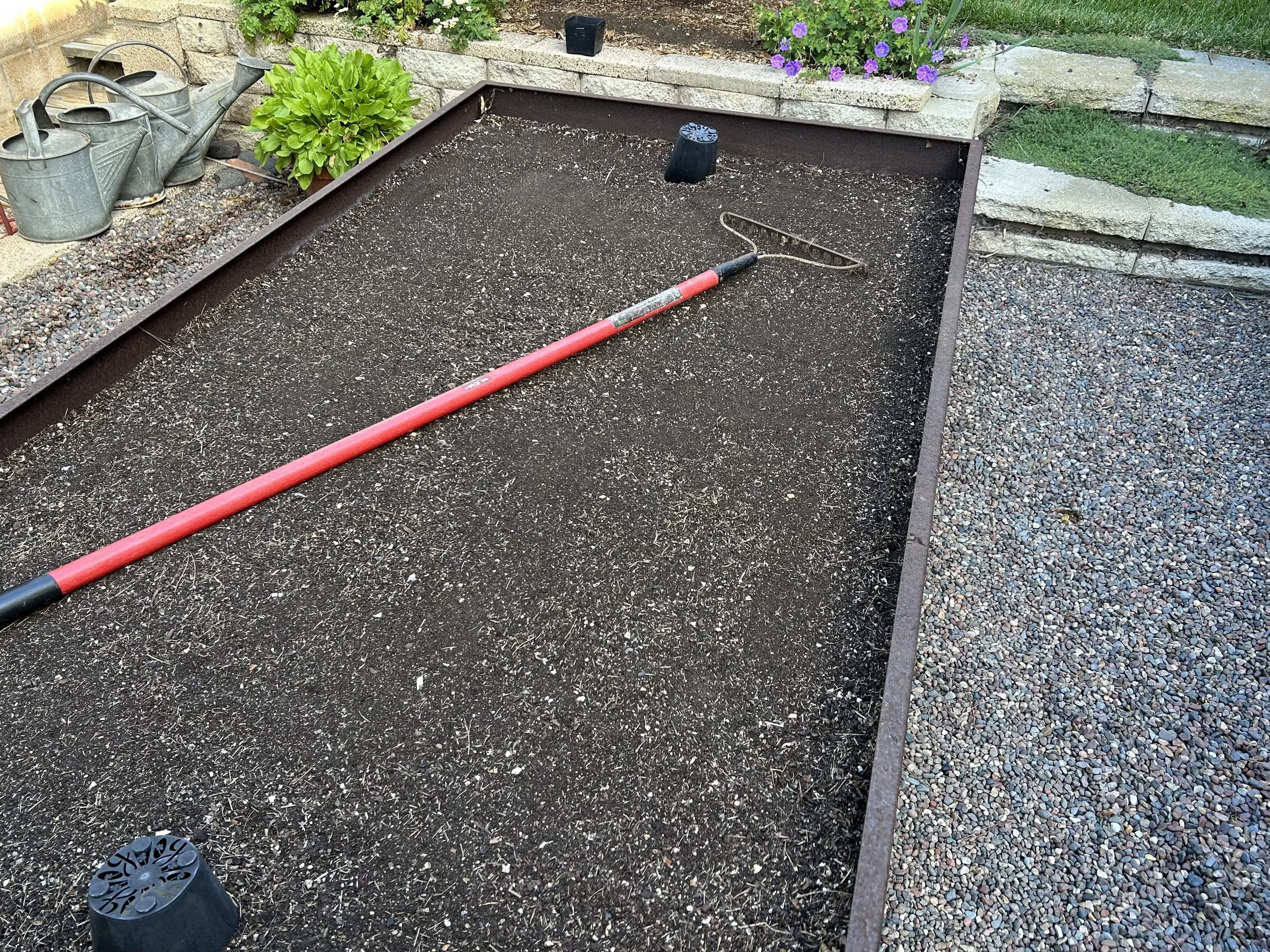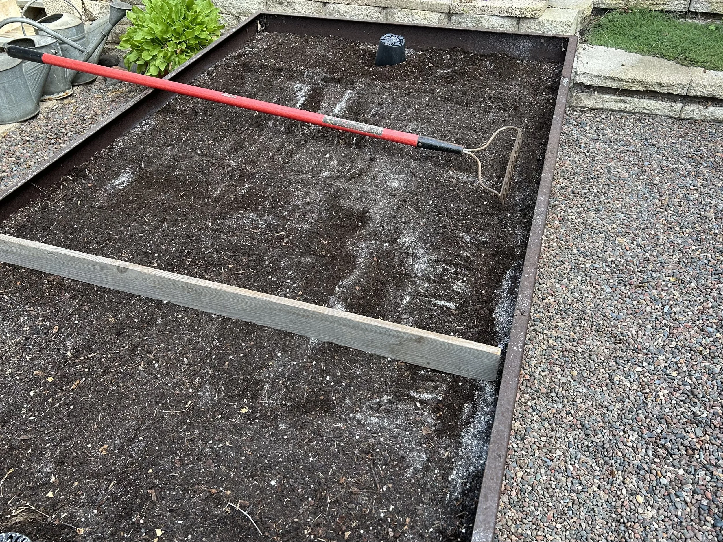 First, I rake the soil of loose debris and roughly level the bed with a rake.
