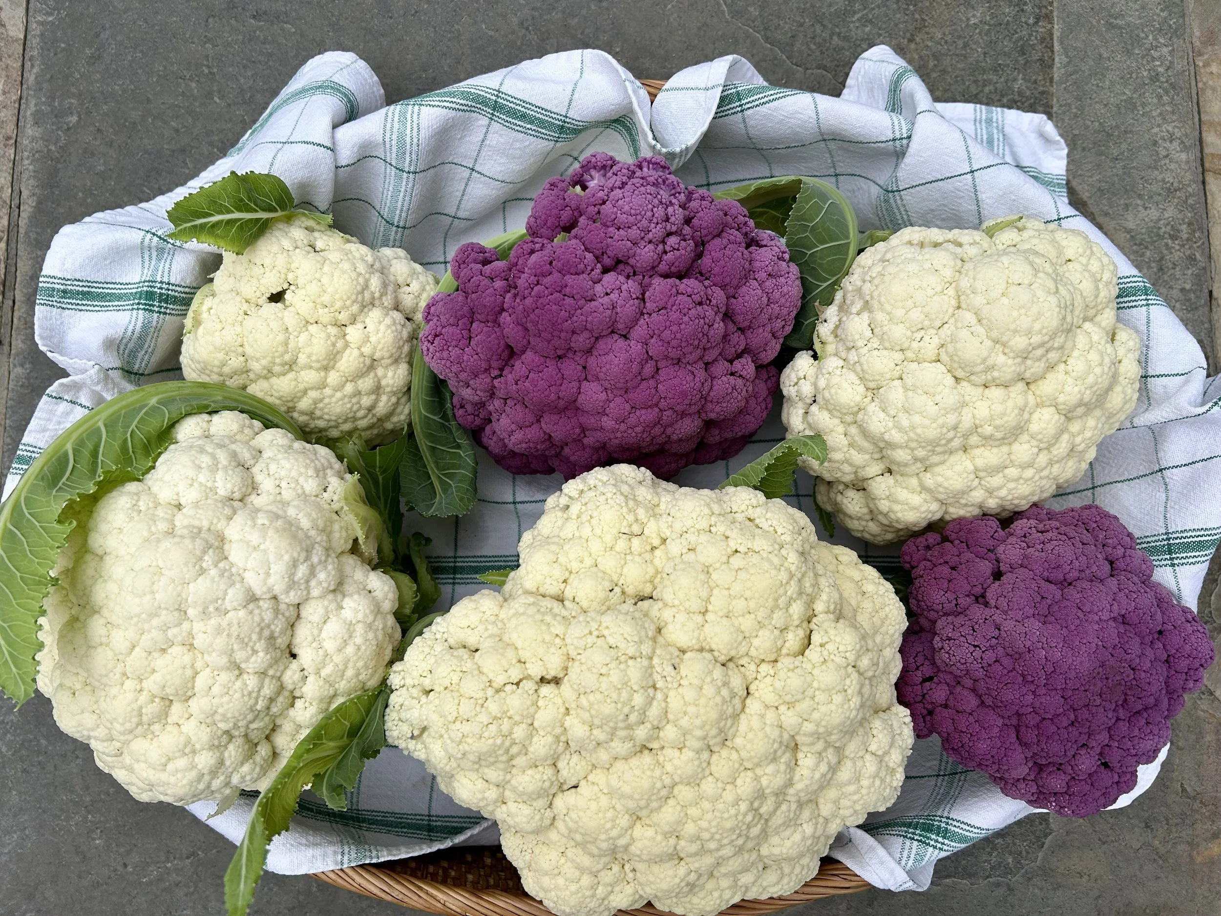 The Graffiti cauliflower, also from Territorial Seed, has a staggered harvest this season and will likely extend over two weeks. After growing DePurple last year, I returned to Graffiti for the rich magenta hue. DePurple has some advantages in growing and cooking.