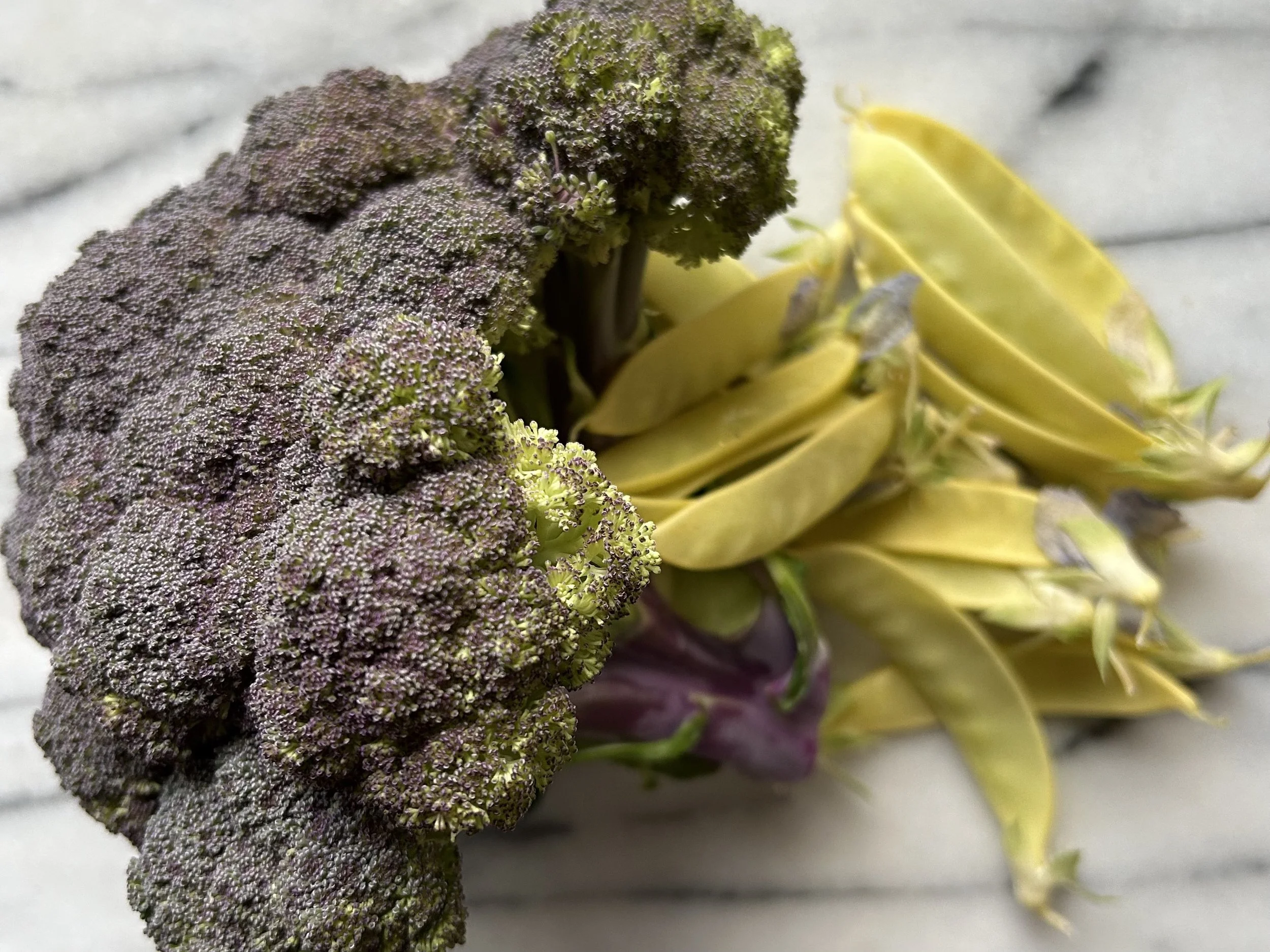 The last of the Purple Magic broccoli with the purplish stems and the first of the Golden Sweet snow peas.