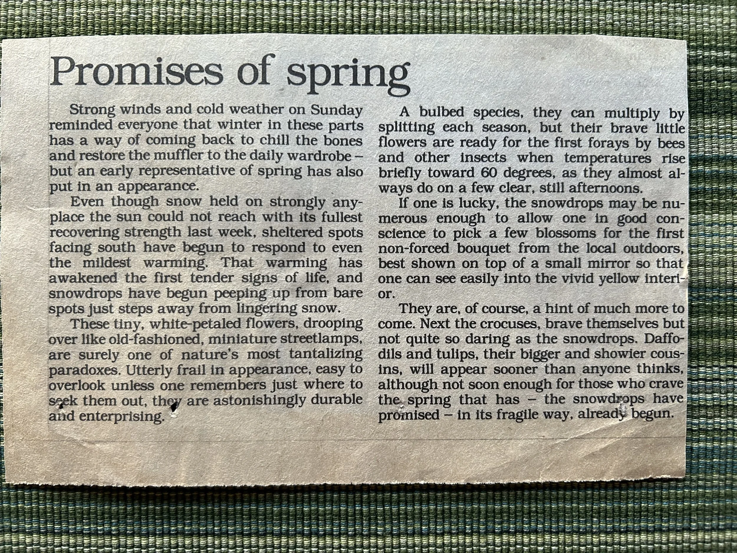 Though spring is in full flower in my San Diego garden, I recall with poignancy the nascent signs of spring in my Massachusetts garden. The Boston Globe provided thoughtful reflections on the season and I found this clipping from the 1980’s among saved treasures.