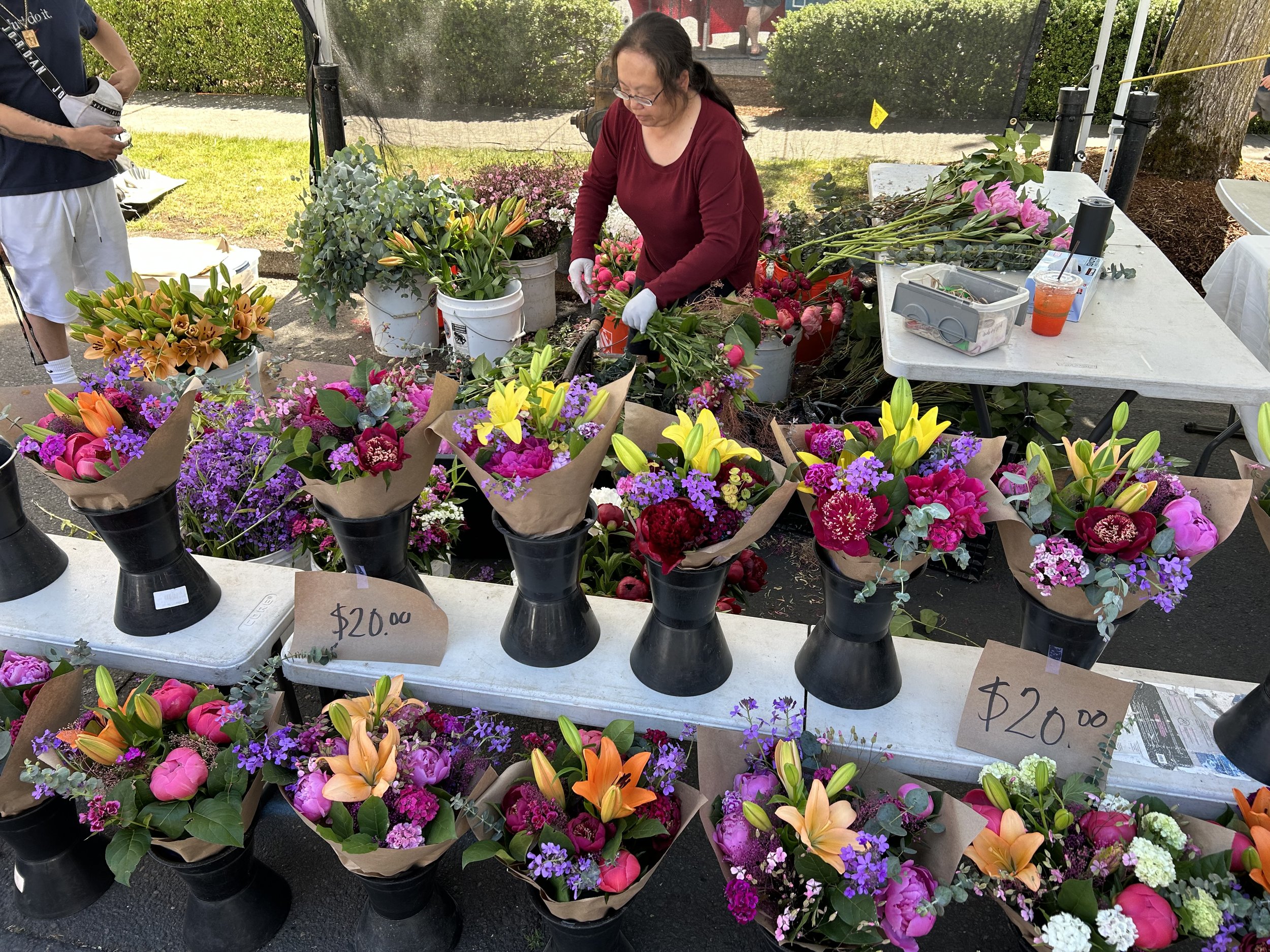 Oh to have red (instead) of green rhubarb for colorful desserts. The strawberries were red through the center and much more flavorful than SoCal varieties. I’ve grown sprouting broccoli with only limited success but I can admire what the Oregon farmer offers. Who else brings edible cornflowers to the market?