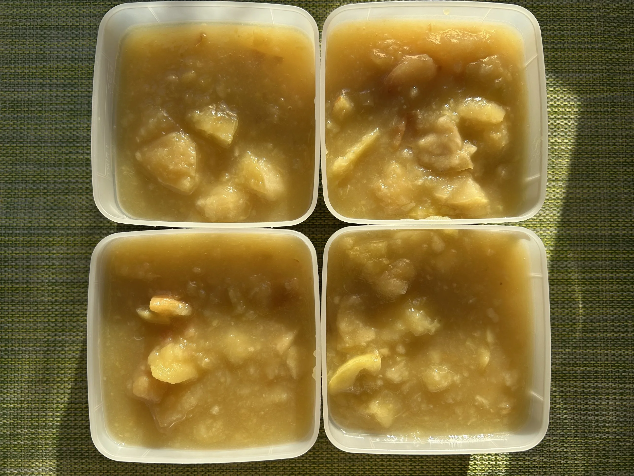 Dorsett Golden apples that were stored in the fridge for a month became applesauce for the freezer. The best apples remain for late summer apple desserts, while a second smaller crop will arrive late fall.