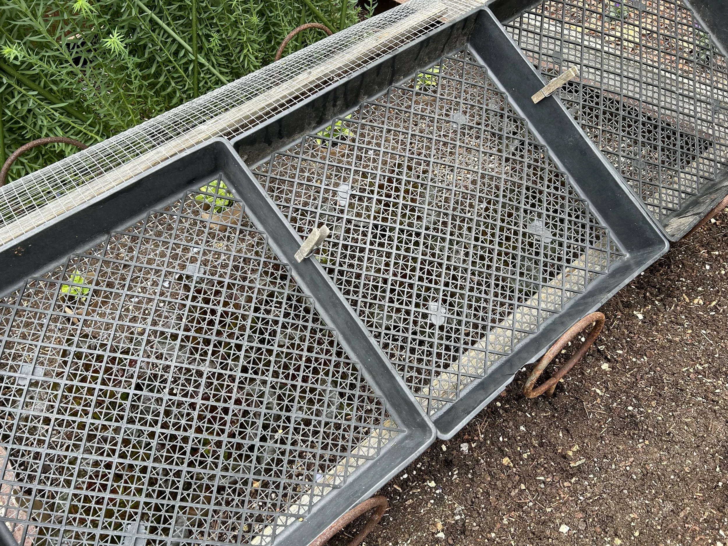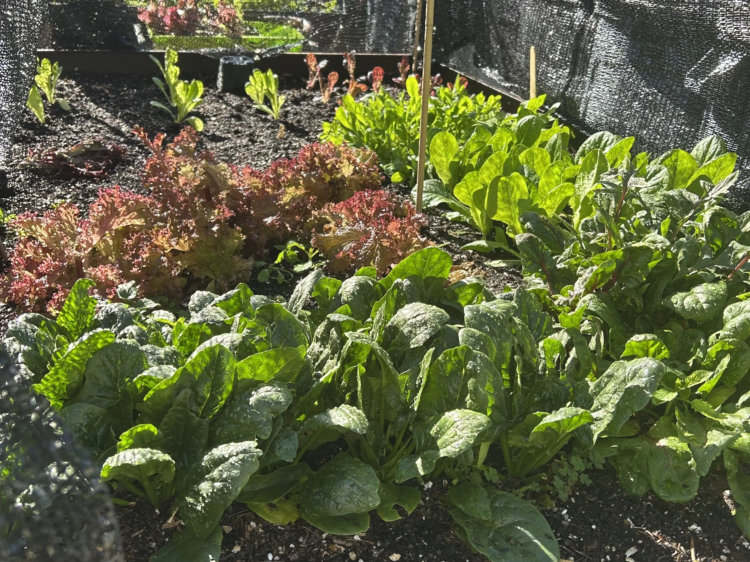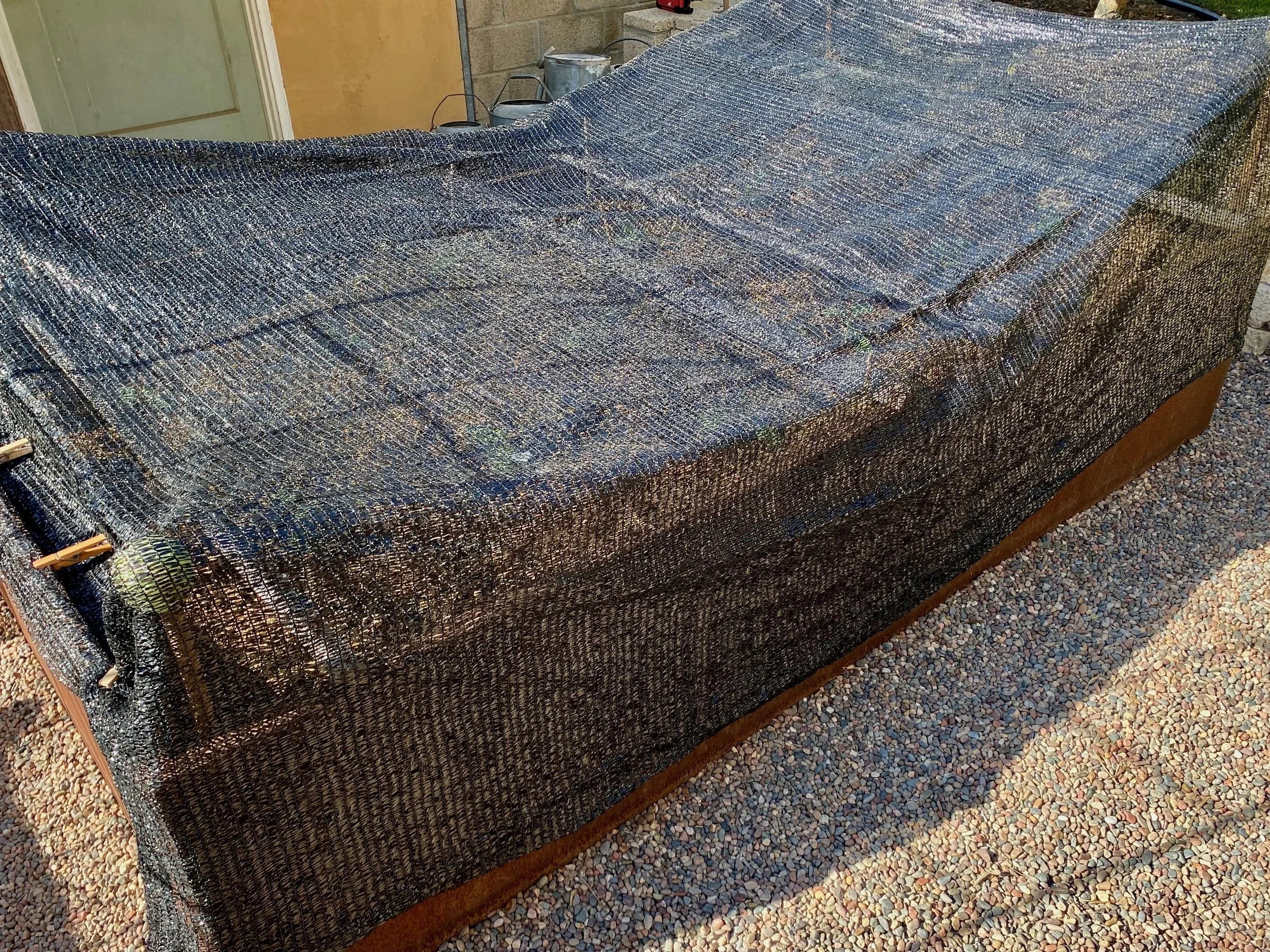 Four stakes topped with an old tennis ball hold it above the seedlings. Clipped to the sides of the raised beds it excludes cabbage moths but lets smaller beneficials in. The dew settles through the mesh shade cloth and I’ve misted the plants through it when needed. As the weather cools and humidity rises, I’ll remove the shade cloth until the next Santa Ana event.