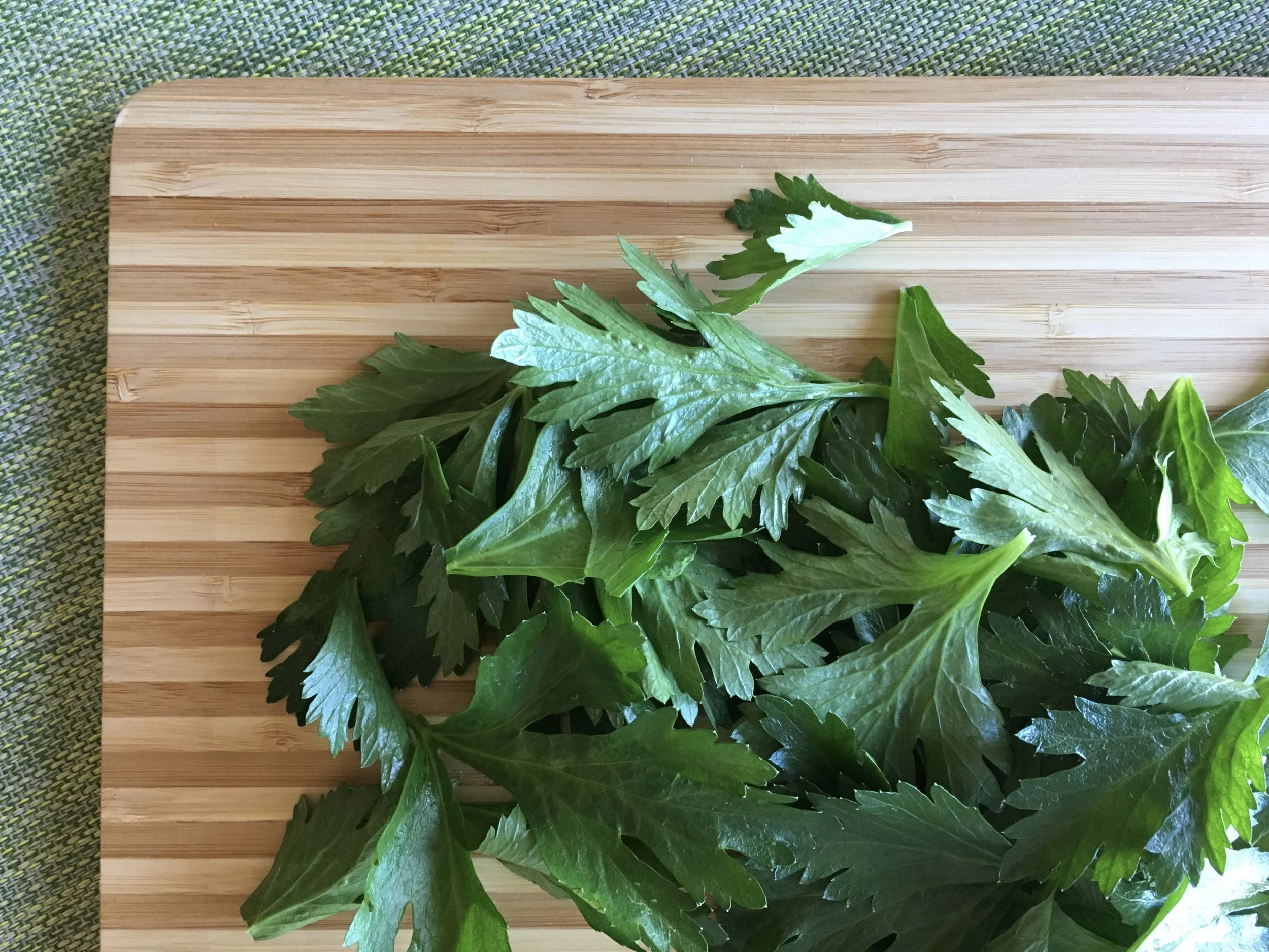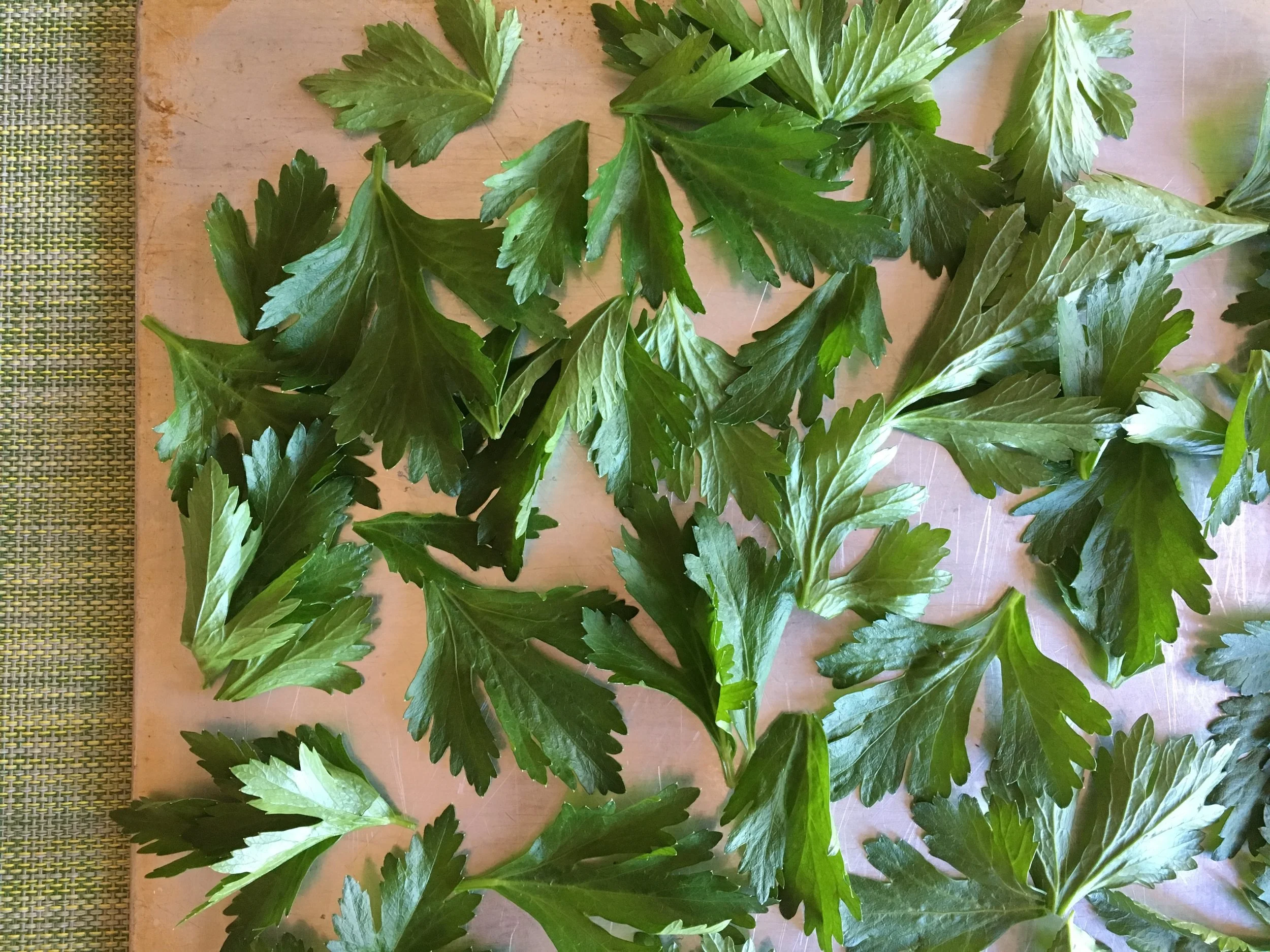 I washed the celery leaves and used the lettuce spinner to extract the water. Then I patted them very dry between layers of paper towel.